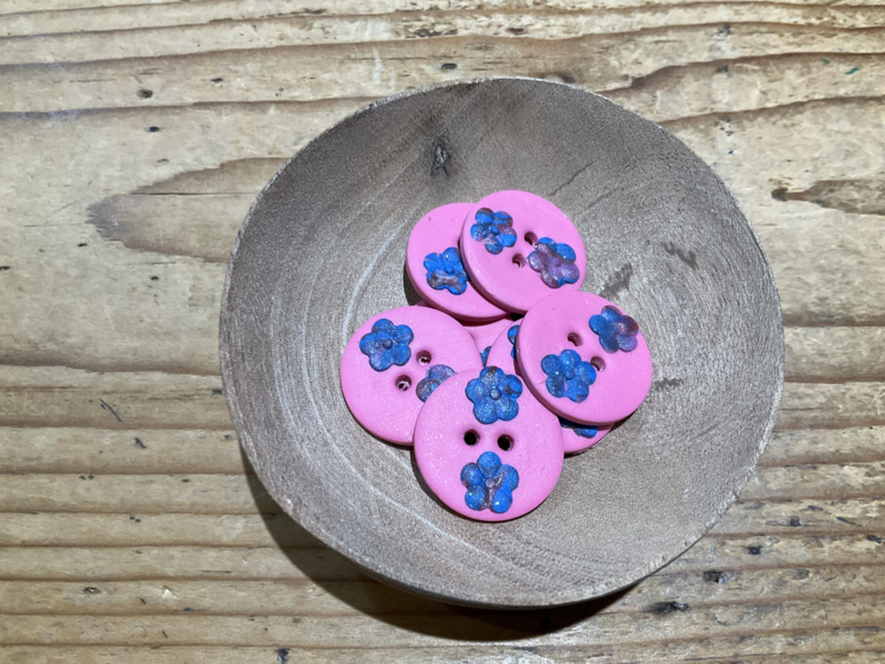 Ronde roze knoop met bloemetjes in blauw gemêleerd. 20mm